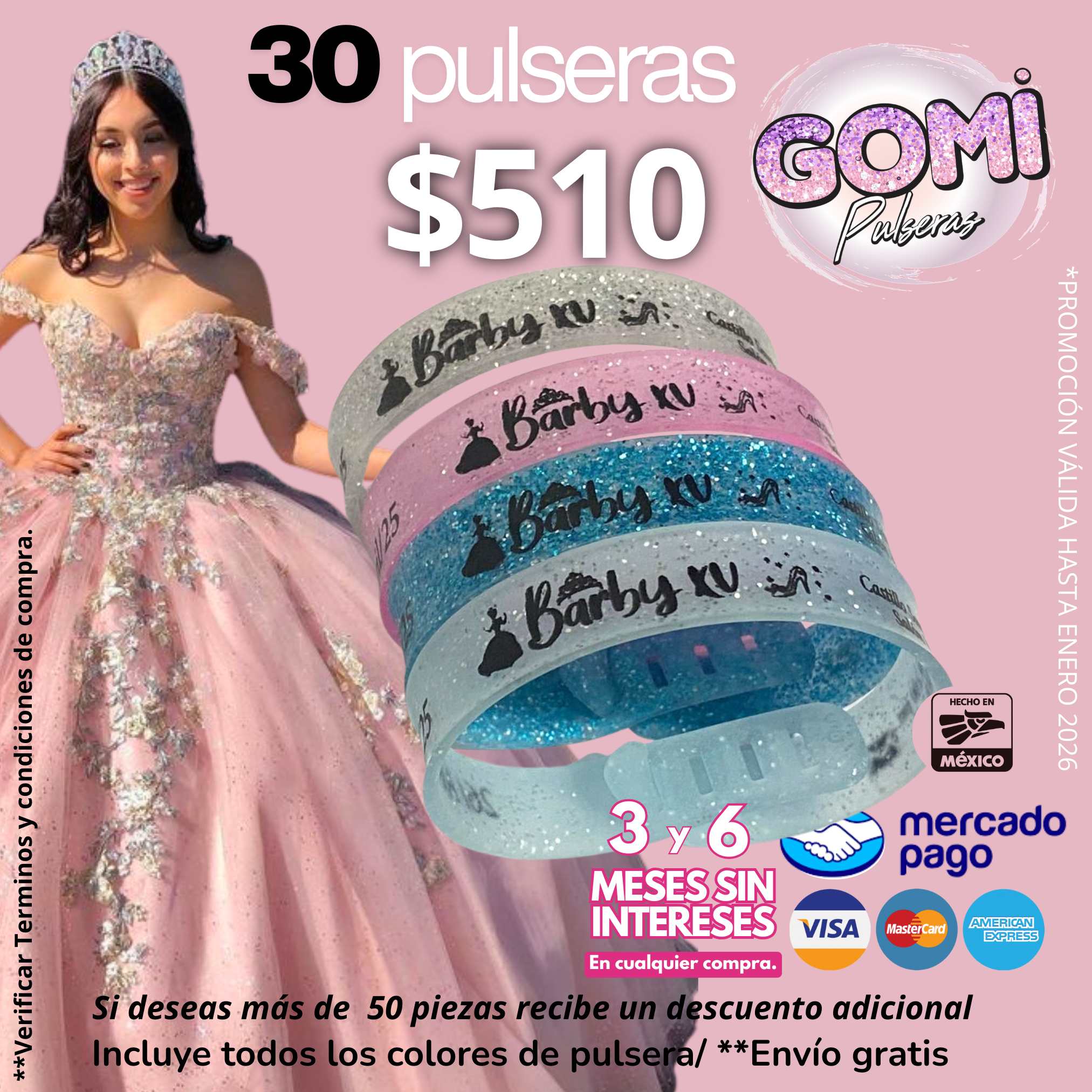 Si tus pulseras son solo glitter, elige si deseas el pintado de tus pulseras por el lado brilloso ó por el lado opaco, leer más en preguntas frecuentes.